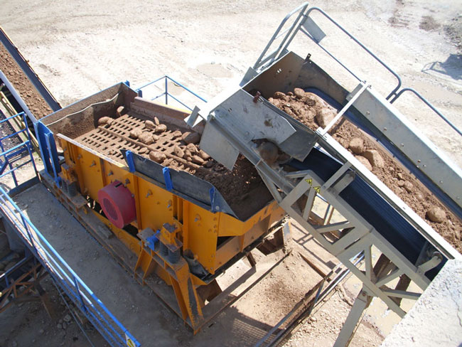 Los camiones llegan de la cantera y descargan el material en una tolva llamada Alimentador, que transportará el árido por unas cintas hasta llegar al Precribador, que según el tamaño de este divide el proceso en dos: